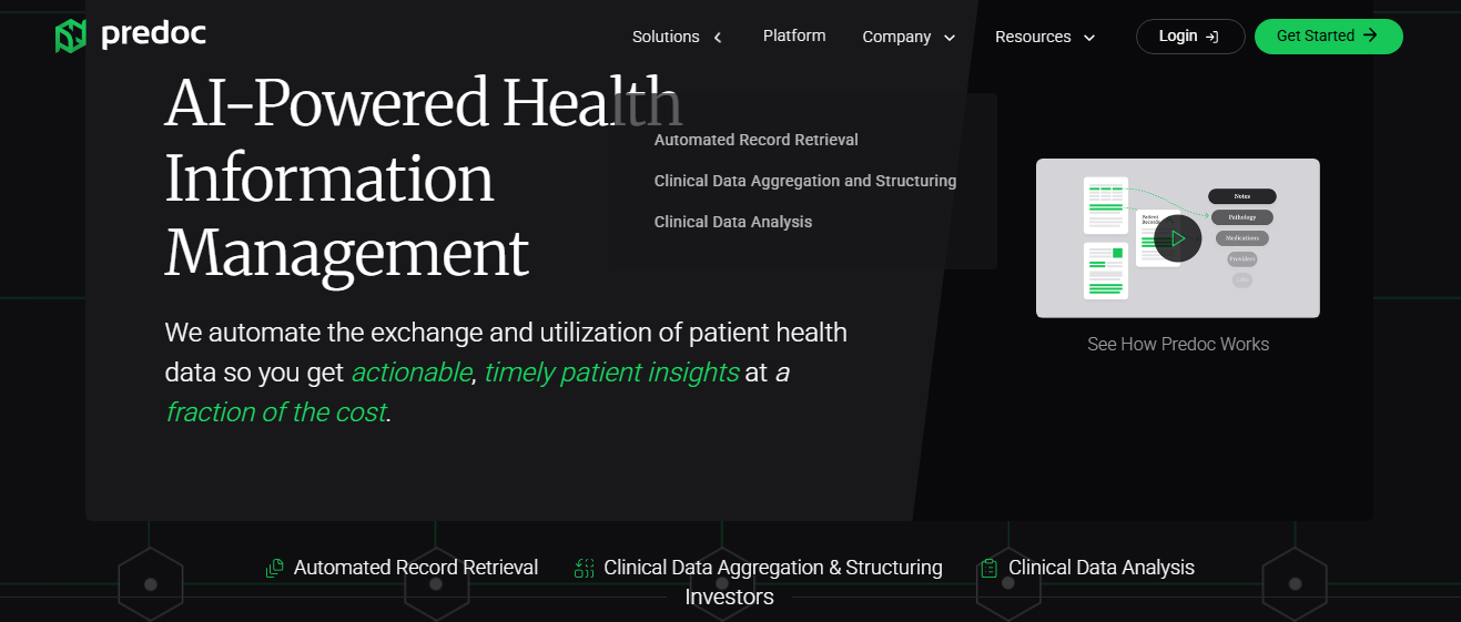 It then extracts data from digital files and PDFs, structures unorganized records, and indexes them for clinical use. Predoc also analyzes the aggregated data to answer clinical questions, support trial eligibility checks, and generate clear patient summaries.
