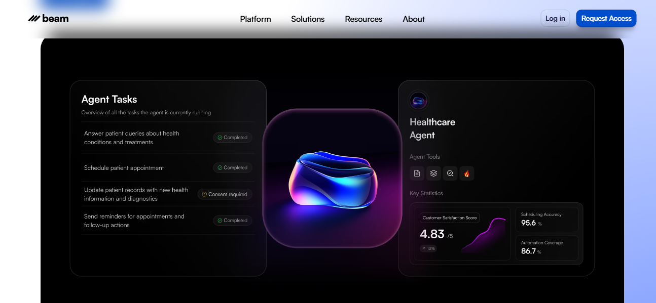 | Healthcare AI Agent by Beam AI | Operational and patient service workflows | Data cleaning, scheduling, intake, prescription handling, symptom triage, workflow execution |