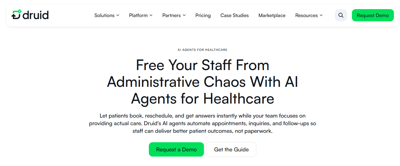 | Healthcare AI Agents by Druid AI | Multichannel patient access and admin tasks | Appointments, symptom checking, reminders, billing, insurance workflows, FAQs |