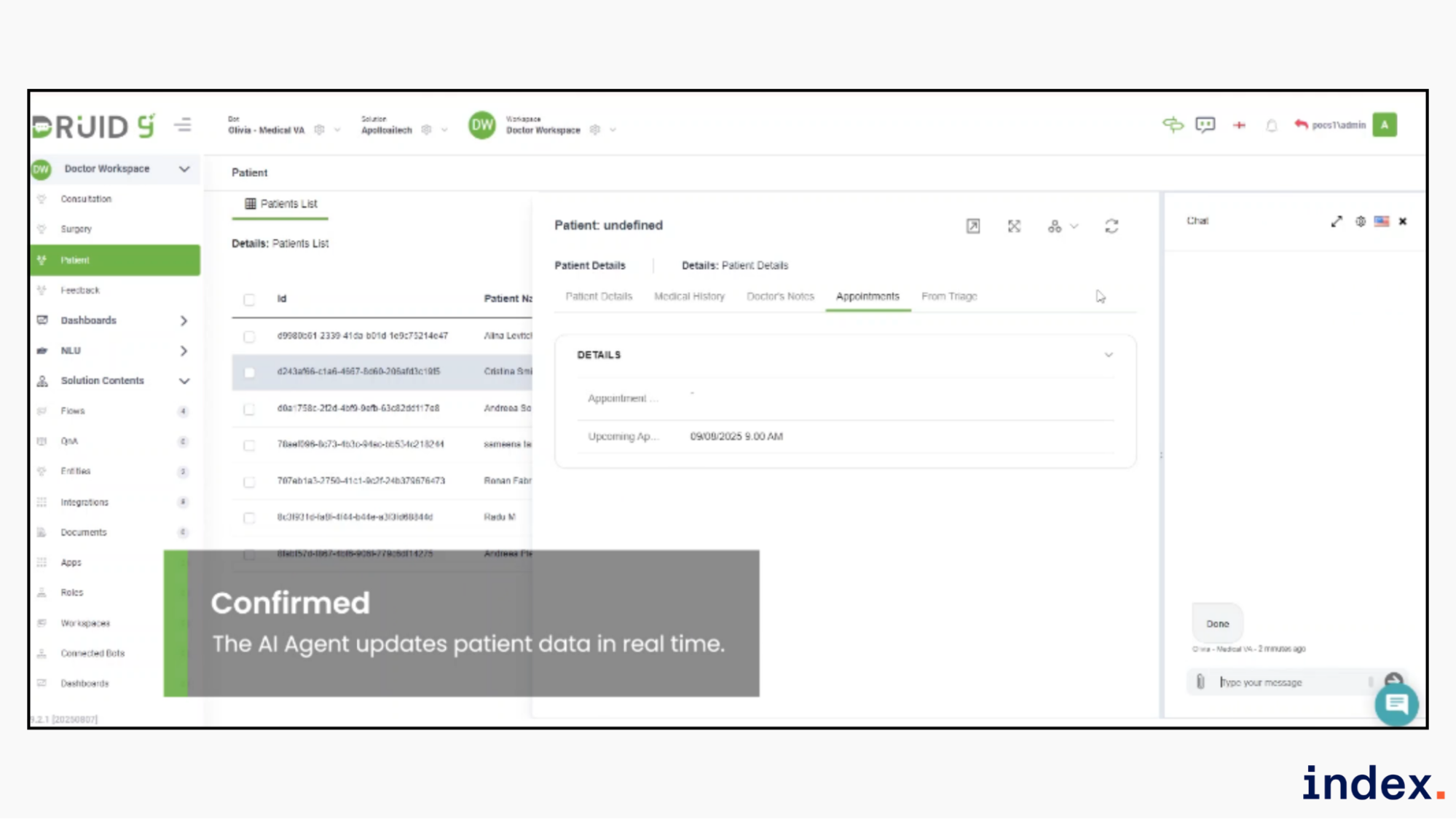 Healthcare AI Agents by Druid are autonomous, goal-driven AI agents built to handle end-to-end healthcare workflows. Once deployed, the agents interact with patients, collect information, decide next steps, and execute actions without staff involvement.
