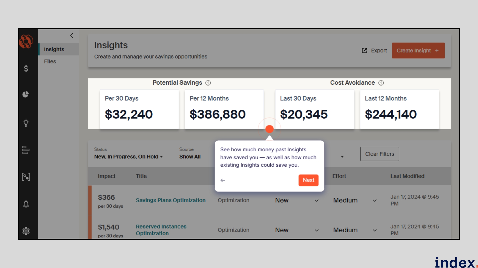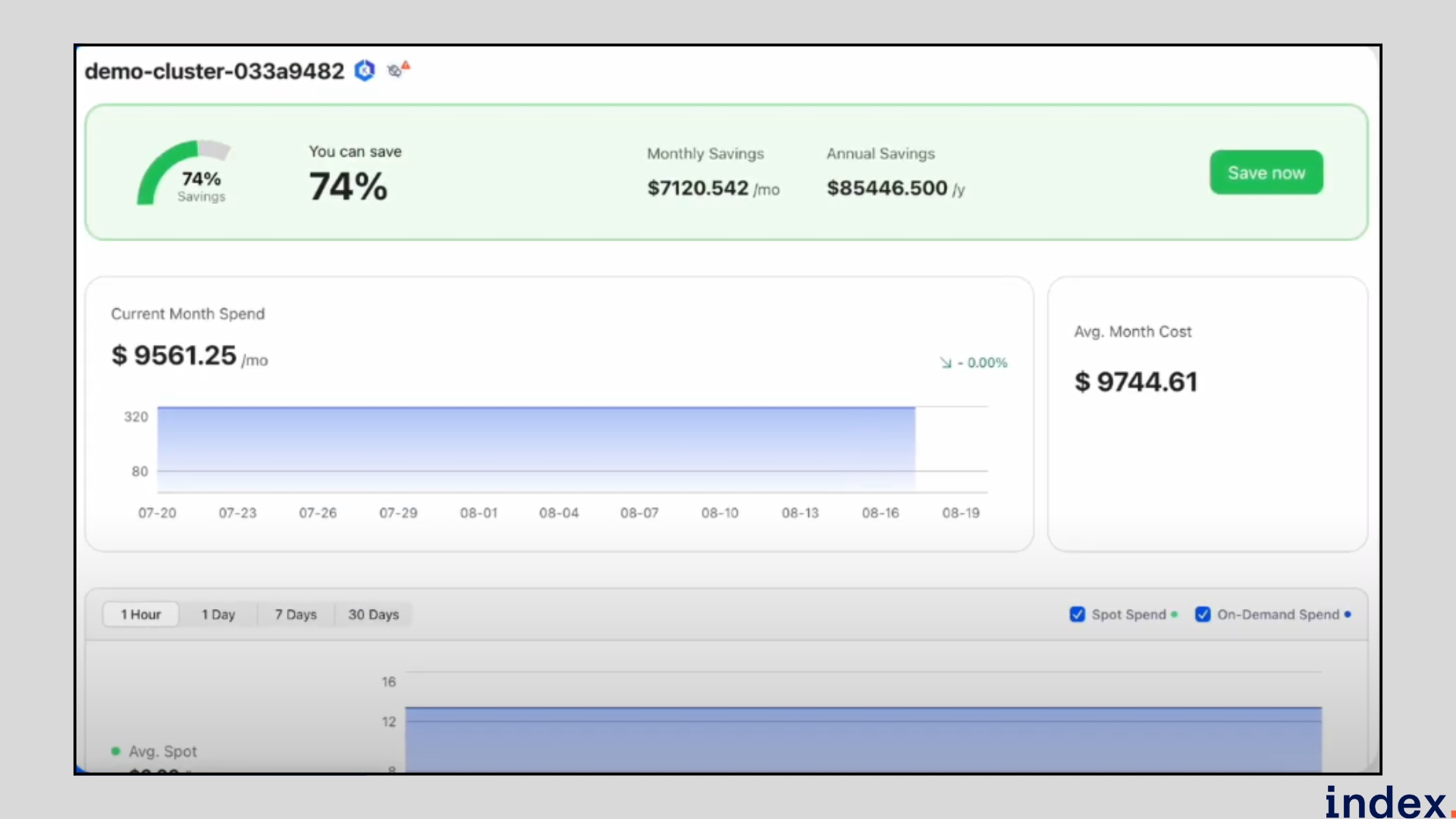 - Savings tracking & ROI measurement: Measures realised cost reductions, enabling teams to validate impact and refine optimisation.