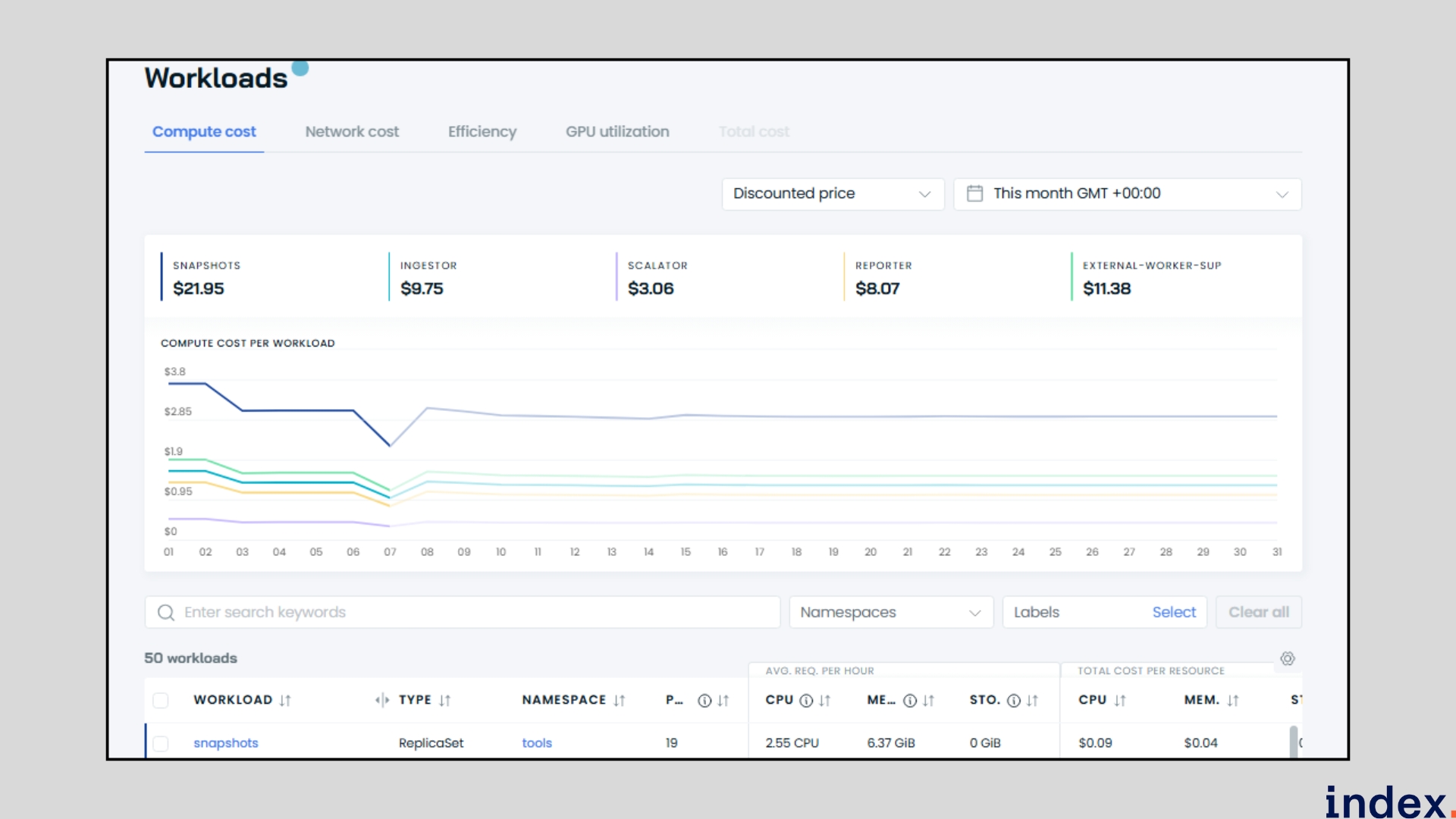 - Real-time cost & utilisation dashboards: Provide live visibility into costs by cluster, namespace, workload, GPU, and network traffic, so teams can spot waste and validate optimisations quickly.