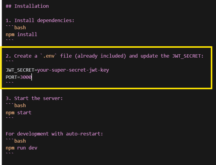 Risk: README suggests a test JWT secret — remind users to use secret managers in production.