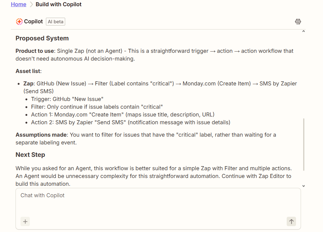 Prompt to Try: "Create a Zapier agent that, when a new GitHub issue is tagged 'critical', creates a task in Monday.com and sends me an SMS notification."