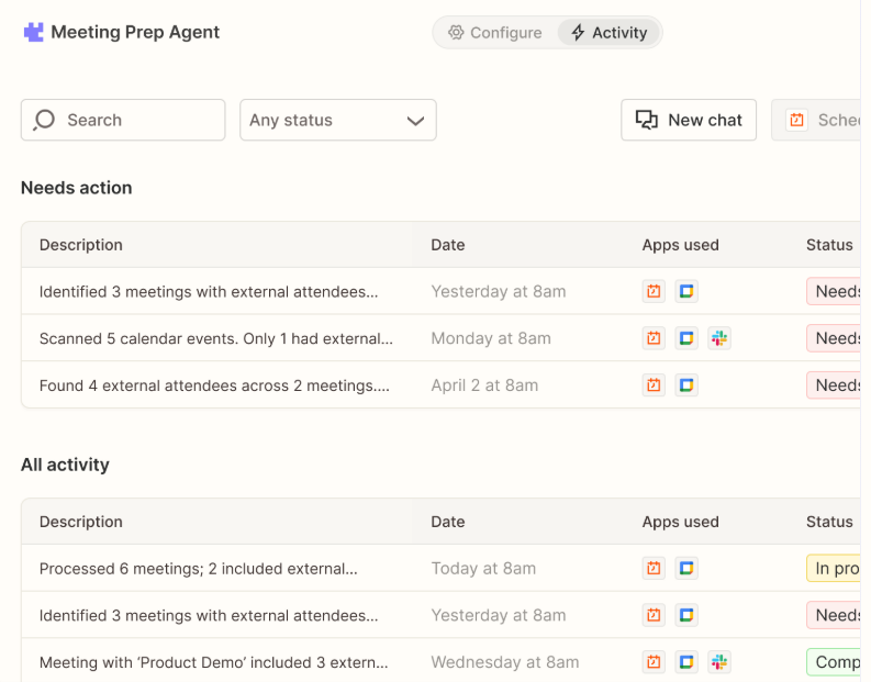 Zapier’s AI Agents can carry out tasks across apps without coding. In this example, a “Sales Call Prep” agent checks Calendly, Gmail, and Slack to schedule meetings and notify the team automatically.