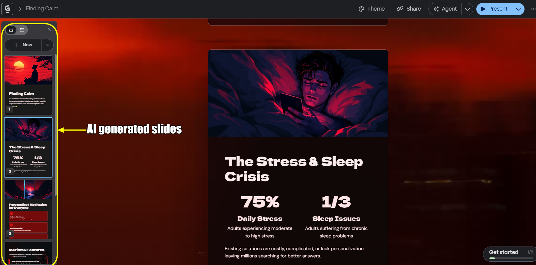 - "Create a 5-slide pitch deck for a meditation app, including problem, solution, market, features, and team."