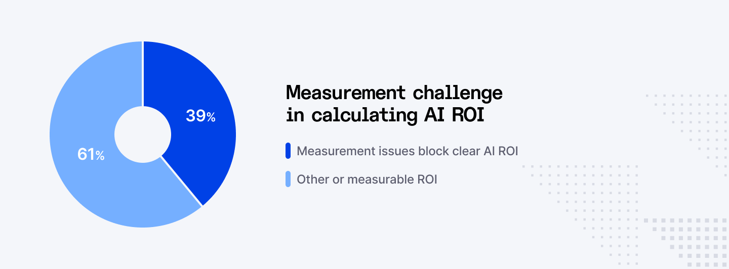 - 39% of executives report that measurement problems prevent them from calculating AI ROI clearly.