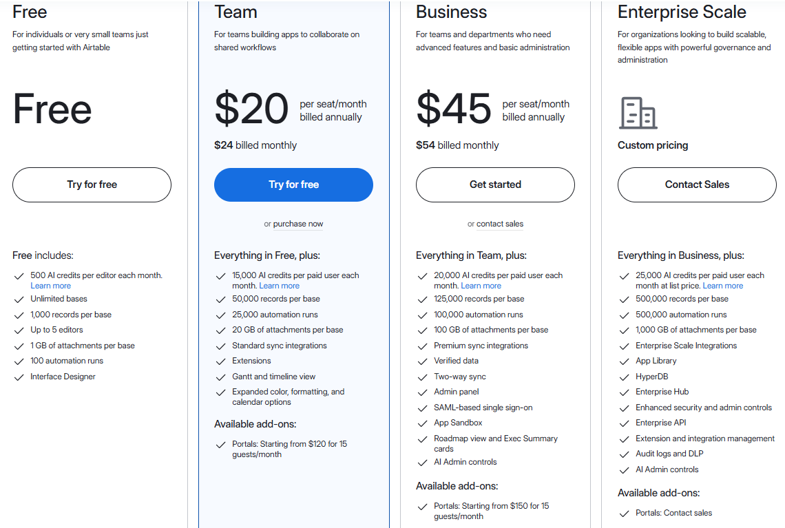 Free to $45/seat/month for base Airtable. Airtable AI add-on: $6-$7/seat/month.
