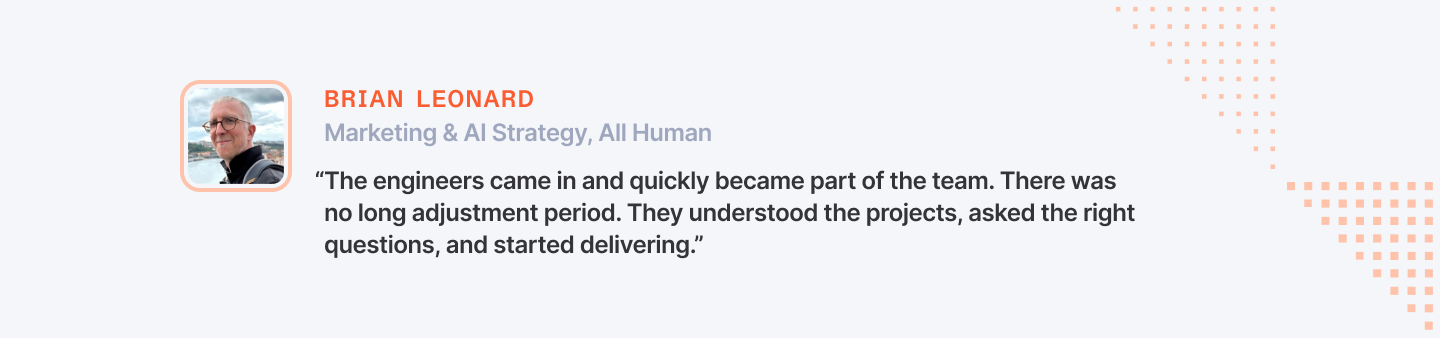 What All Human really needed was a stable extension of their engineering team. Developers who could plug into existing projects quickly, stay long enough to build real knowledge of the systems, and move between projects when priorities shifted. Senior enough to work independently. Grounded enough to integrate without friction.