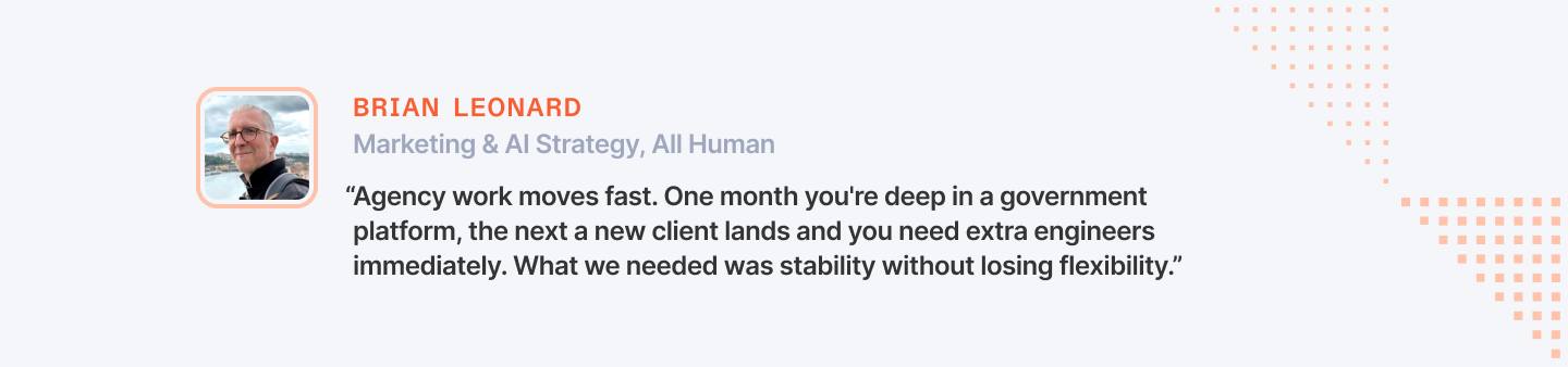 "Agency work moves fast. One month you're deep in a government platform, the next a new client lands and you need extra engineers immediately. What we needed was stability without losing flexibility."