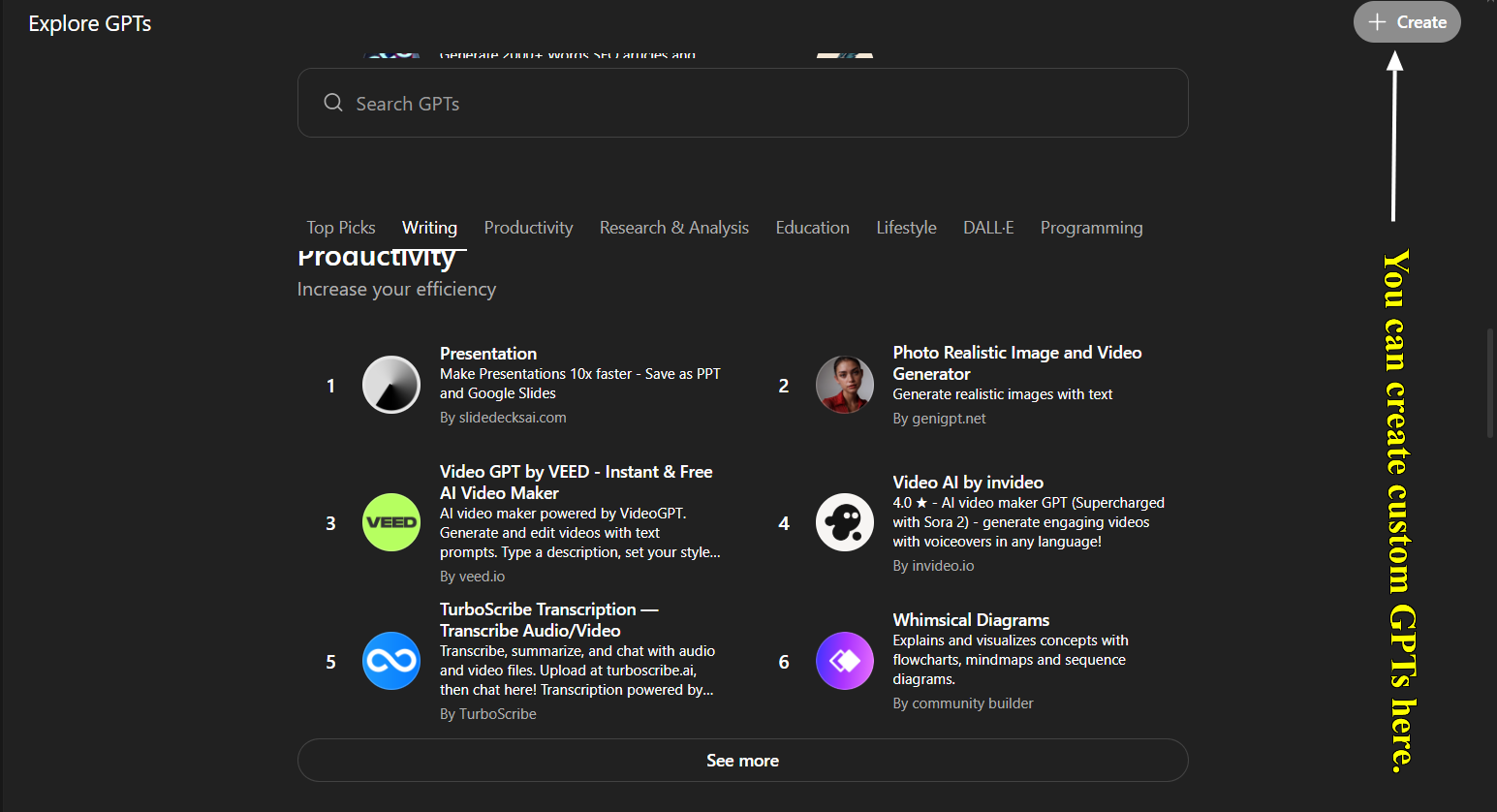 - No custom GPTs creation - can USE existing ones, can't BUILD your own
