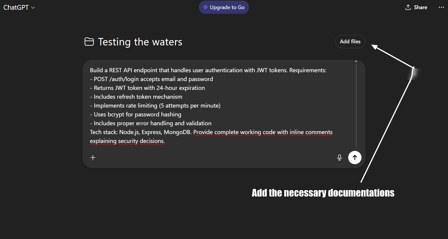 - Prompt required full context prepended: "Context: Node.js/Express app, JWT auth pattern, MongoDB. Task: Build POST /auth/login endpoint with rate limiting..."