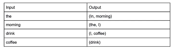 The CBOW model goal is to receive a set of one hot encoding word, predict a word learning the context. So let’s assume that we have the phrase ‘In the morning I drink coffee’, the input and outputs of the CBOW model would be: