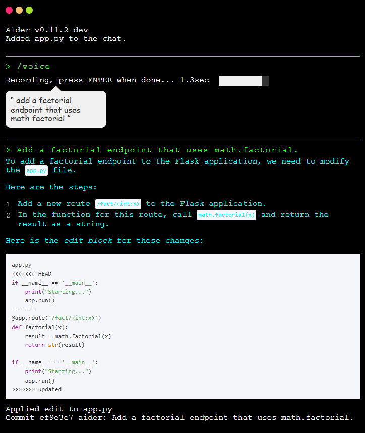 Run aider <files>, describe the change, Aider edits the files and auto-commits with clear messages. Multi-file edits work seamlessly—Aider understands dependencies and makes coherent changes across your project.