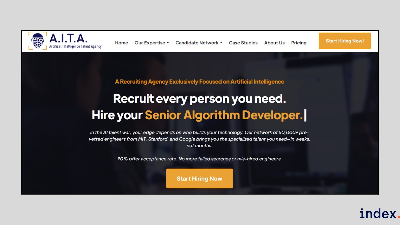 AITA is a recruiting agency built exclusively for AI companies. Instead of competing on generic job boards, they leverage a private network of 50,000+ pre-vetted AI engineers, researchers, and executives sourced from MIT, Stanford, Carnegie Mellon, UC Berkeley, Google, Meta, and OpenAI. This focus allows them to deliver candidates who have already built and scaled real-world AI products.