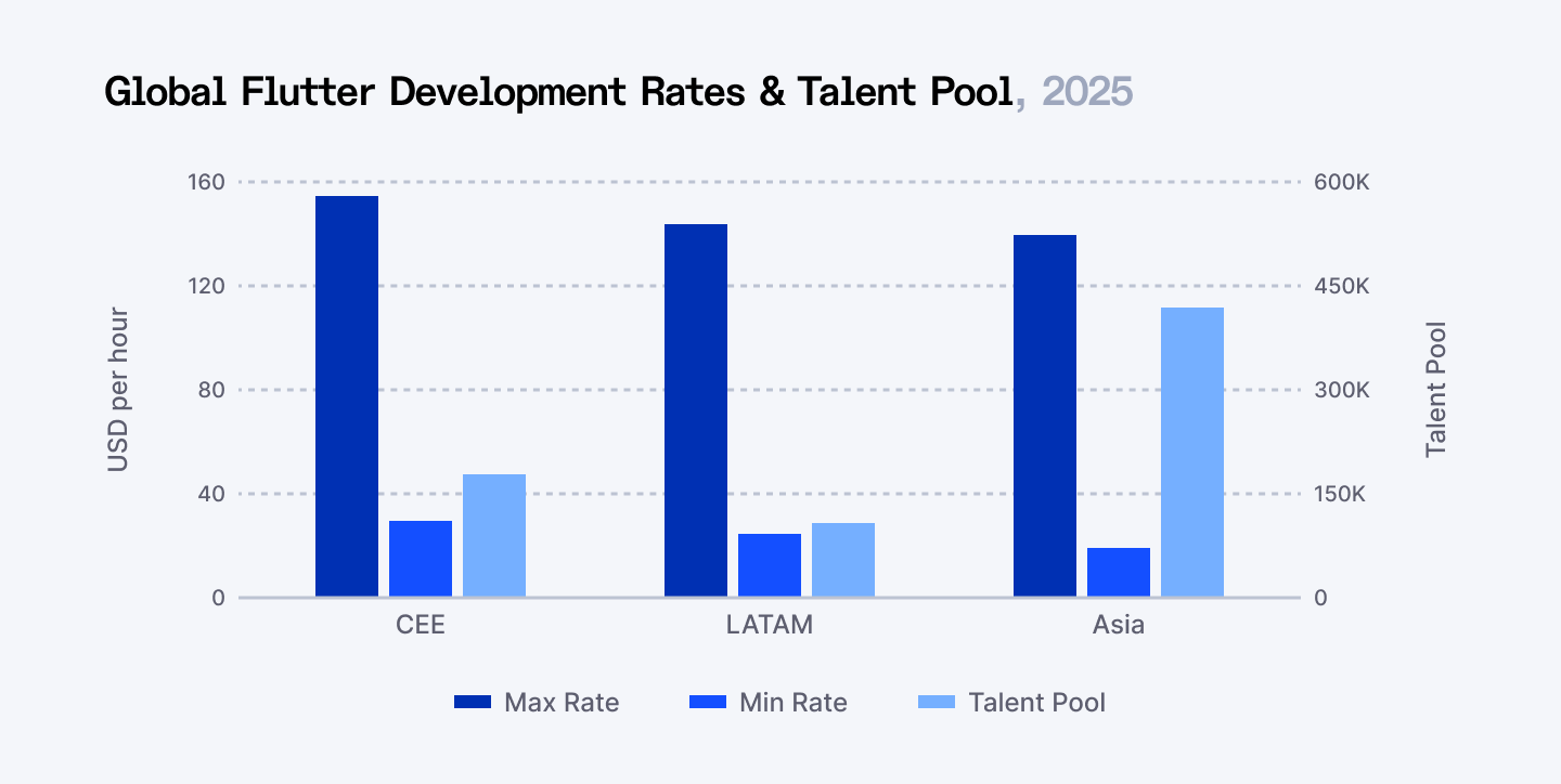 Flutter developer rates in CEE range from $30 to $155 per hour, varying by country and expertise level.