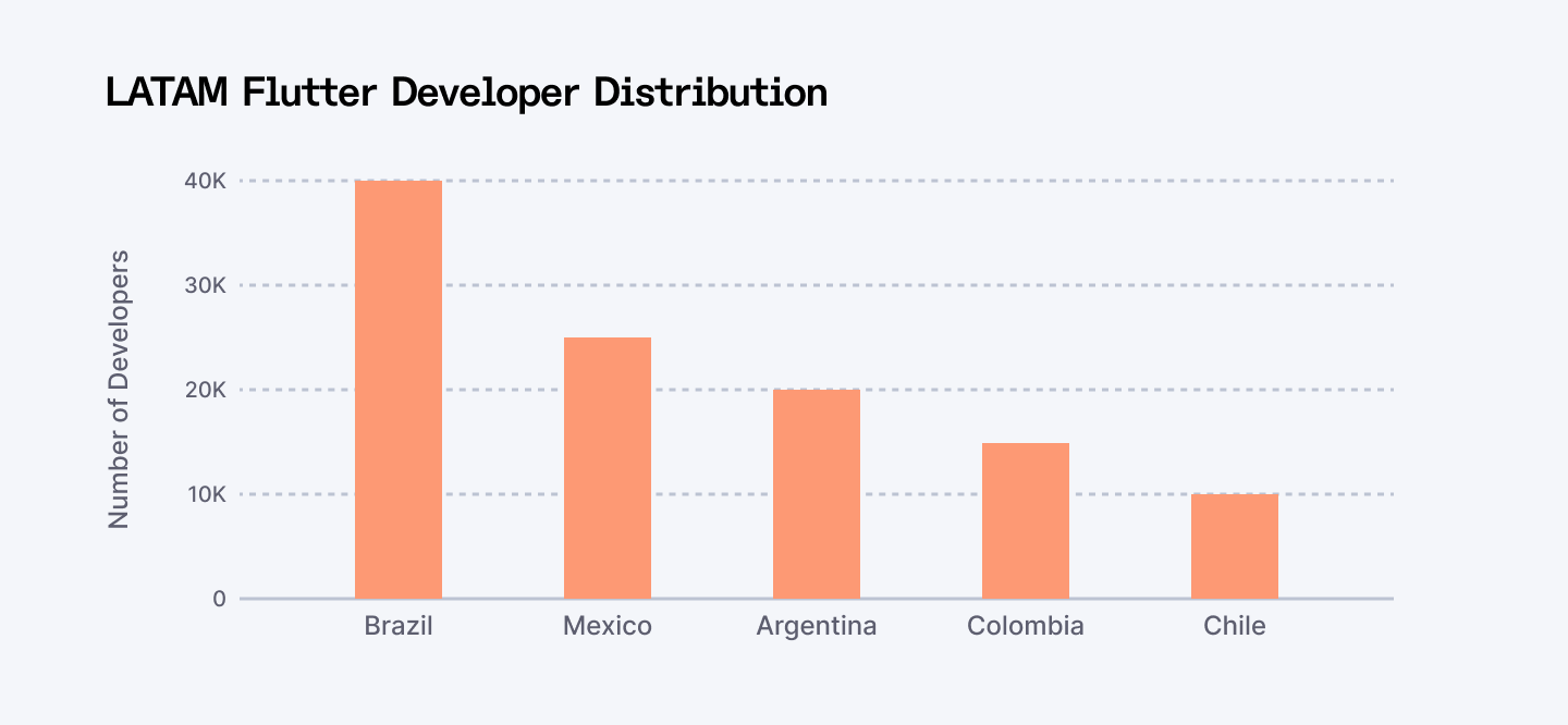 - Brazil: Largest pool with ~40,000 Flutter developers