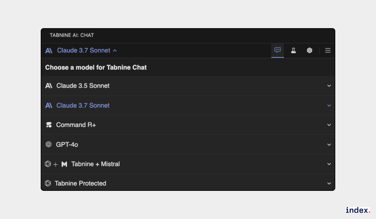 Tabnine supports multiple AI models. It can run its proprietary models, leading third-party models, or even custom models fine-tuned on a company’s own code.