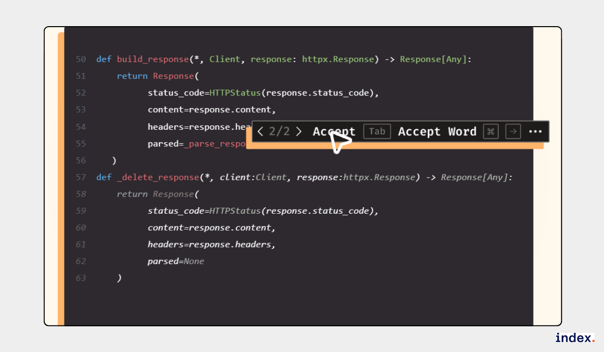 This makes the output more context-aware than GitHub Copilot, which usually looks at the current file and nearby context. For large or complex projects, this deeper understanding helps avoid irrelevant or broken code completions.