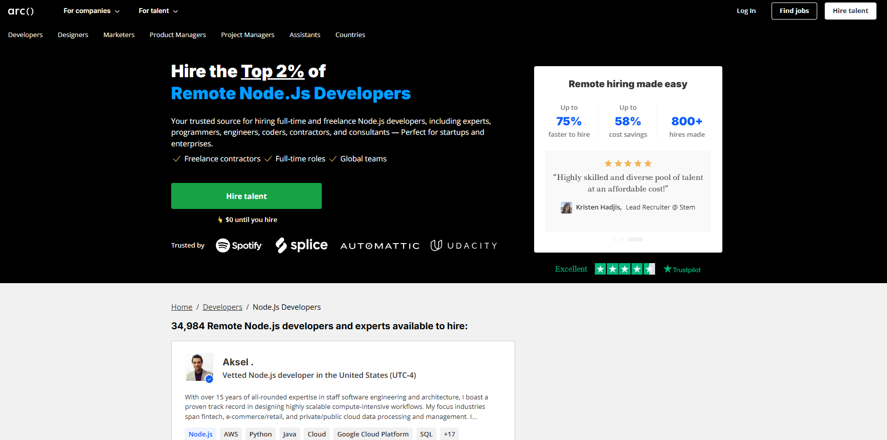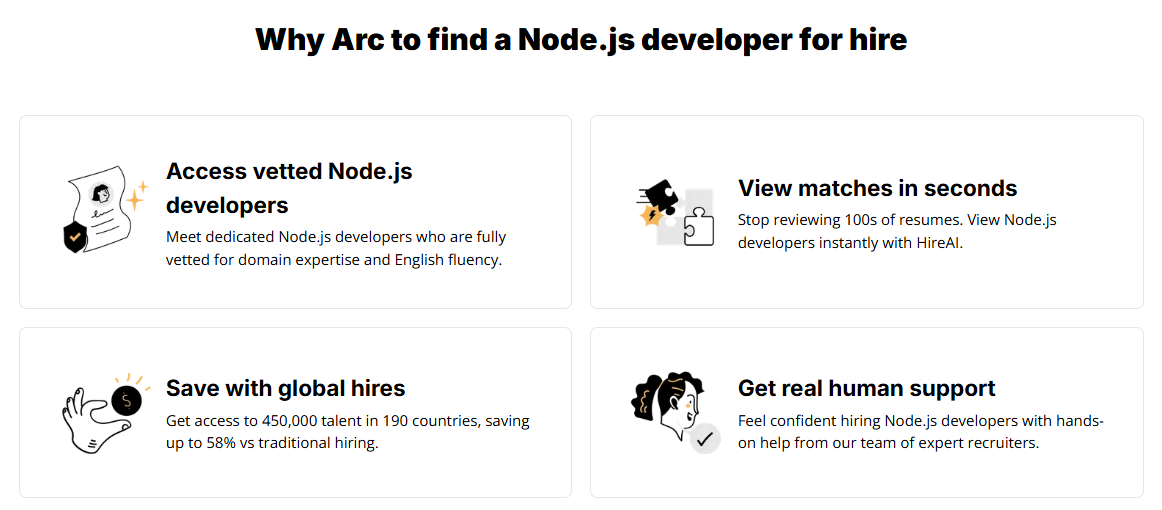 Node.js Talent Pool: Only 2.3% of freelance Node.js developers pass Arc's screening. Their screening emphasizes JavaScript fundamentals, Node.js frameworks (Express, NestJS), database integration (MongoDB, MySQL), and testing frameworks (Mocha, Chai).