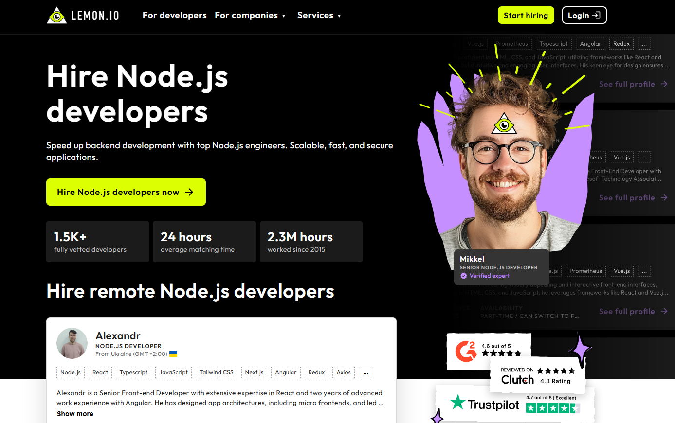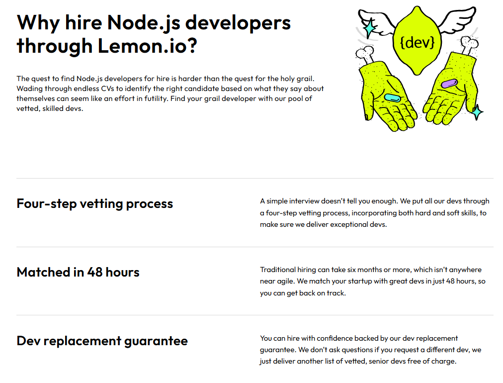 Node.js Efficiency: Lemon.io's Node.js talent focuses on rapid prototyping and scalable architecture—developers comfortable shipping production code under deadline pressure, not building for theoretical perfection.