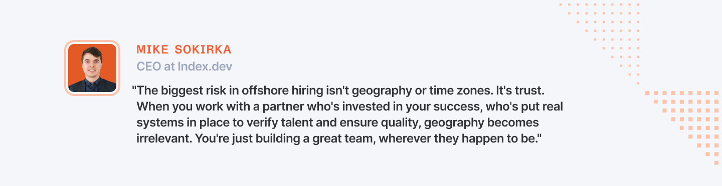 “Every company wants to hire fast, but fast without process is a liability. With the right partner, offshore teams become a source of predictable, high-impact results.” – Mike Sokirka, CEO at Index.dev