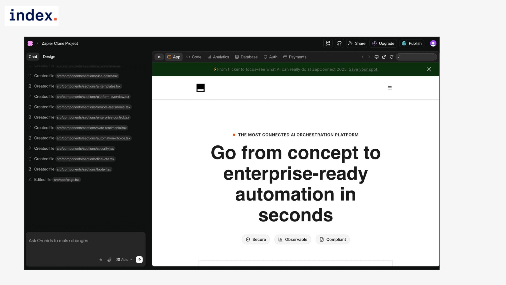Crucially, the generated version was not a static copy. All text and images were editable directly in Orchids, meaning we could change the headline, swap the supporting copy, or replace the hero image without breaking the layout. This made the cloned section a reusable template rather than a hardcoded mock-up.