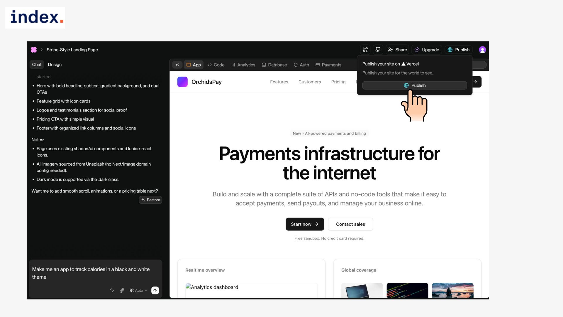 In plain terms, that means it promises to handle the frontend, the backend, authentication, payments, and even deployment, all inside one platform.