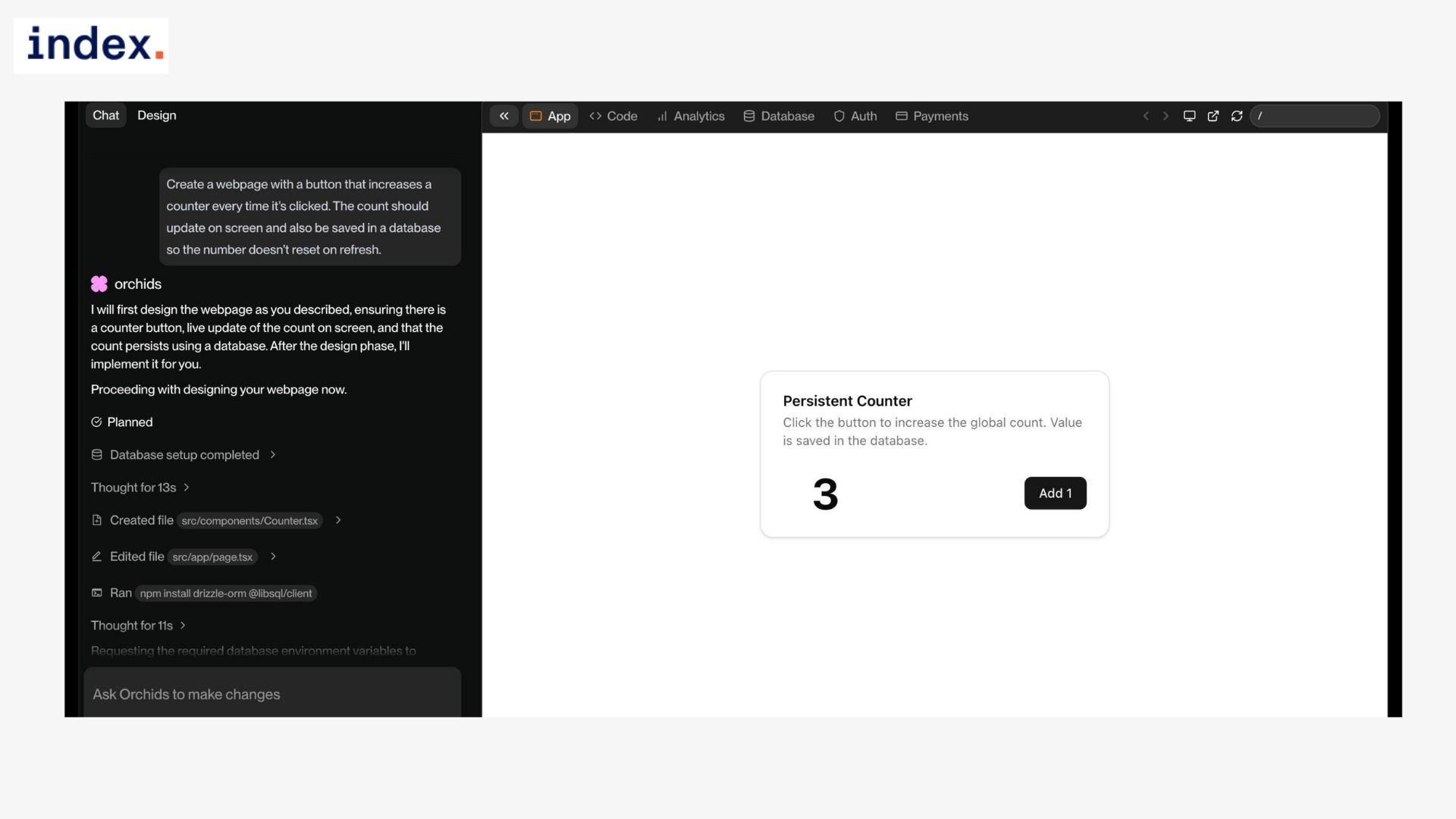 Once submitted, Orchids walked through the steps automatically. It provisioned a database, generated the necessary schema, created a React component for the counter, and wired everything together. The live preview was up within seconds, and the counter UI was simple but functional. We didn’t have to configure an API or write any database queries manually.