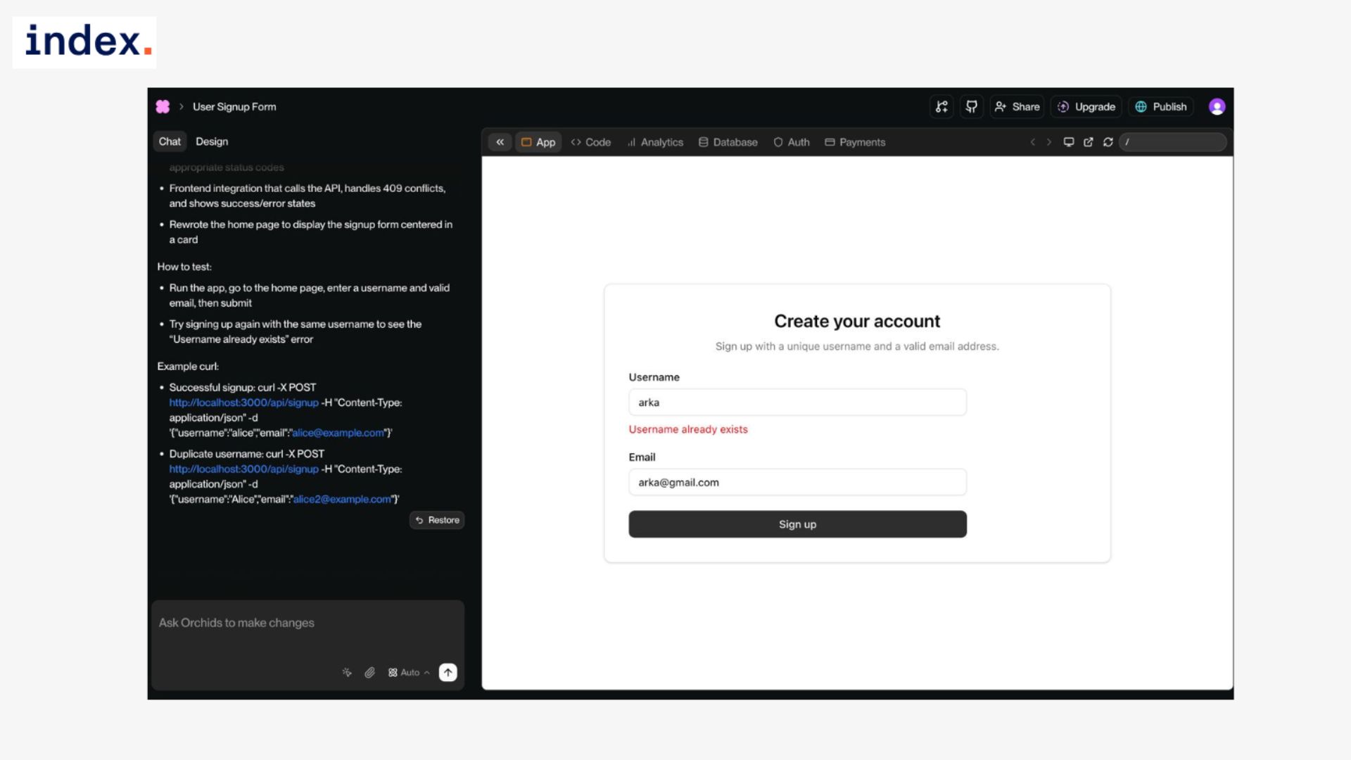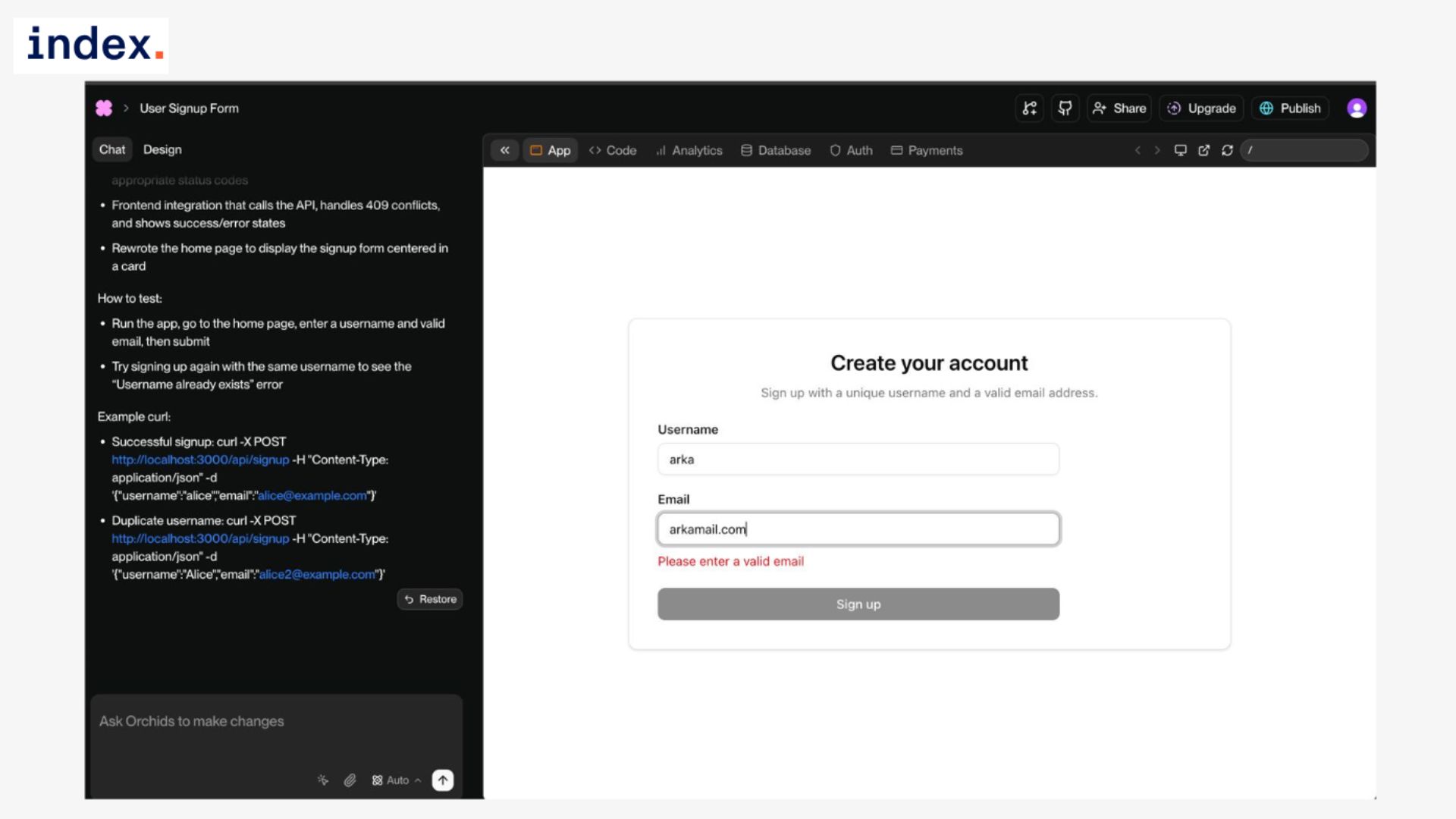 We wanted to show how Orchids handles input validation on both the frontend and backend. The goal was to build a signup form with fields for username and email, where invalid email formats would be rejected instantly, duplicate usernames would be blocked with a clear error message, and valid entries would be saved to the database.