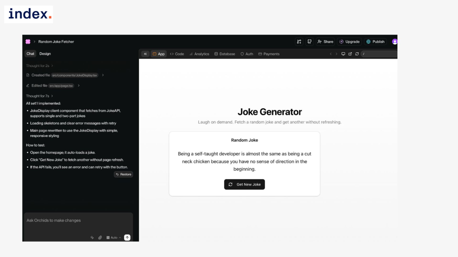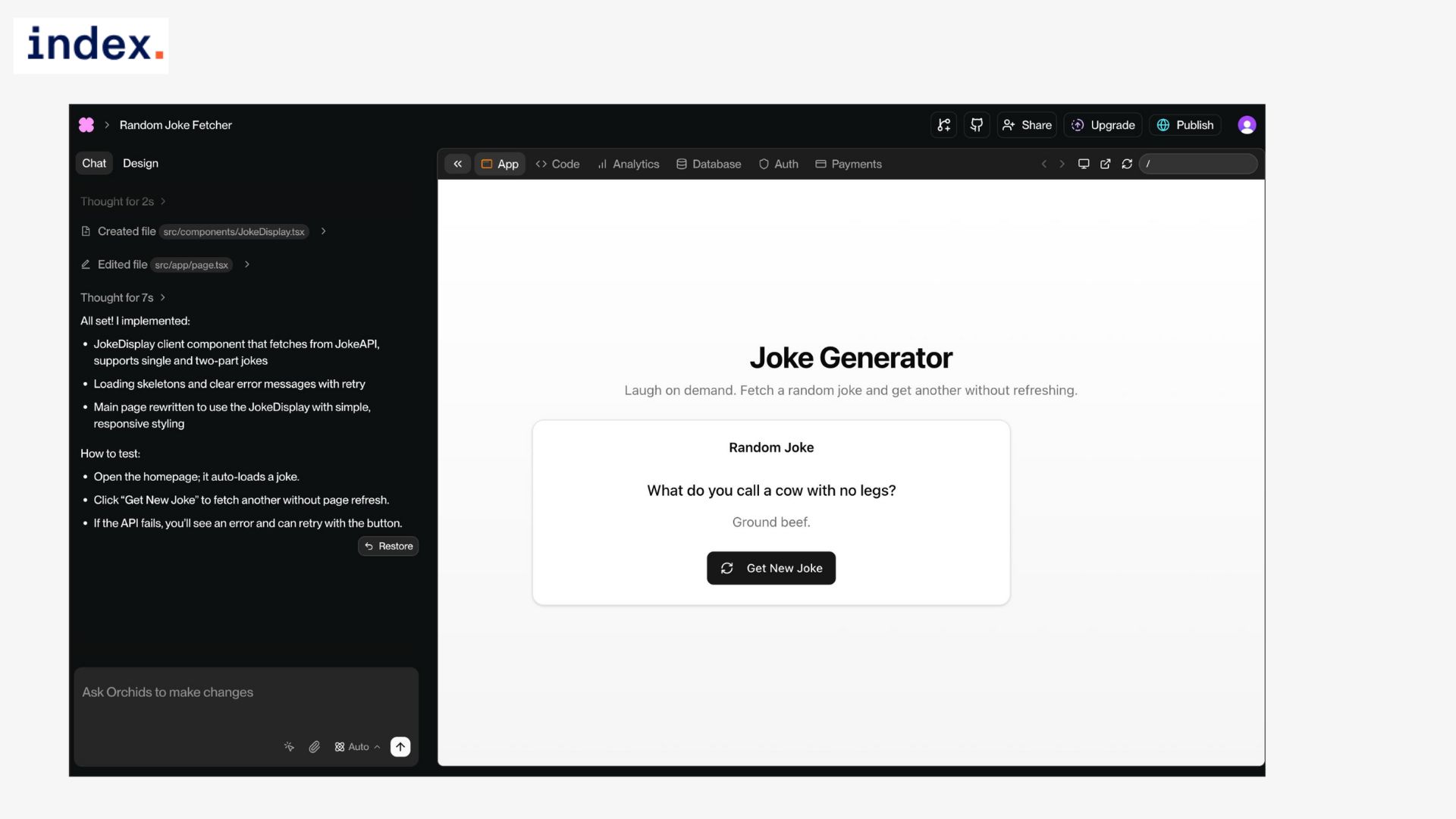We then looked at how it behaved under less-than-ideal conditions. When the API failed, Orchids didn’t crash or lock up. Instead, it displayed a fallback message explaining that something went wrong while keeping the button active so we could retry. That’s an important detail. Many AI-generated apps fall apart when the happy path breaks, but this one had working error handling out of the box.