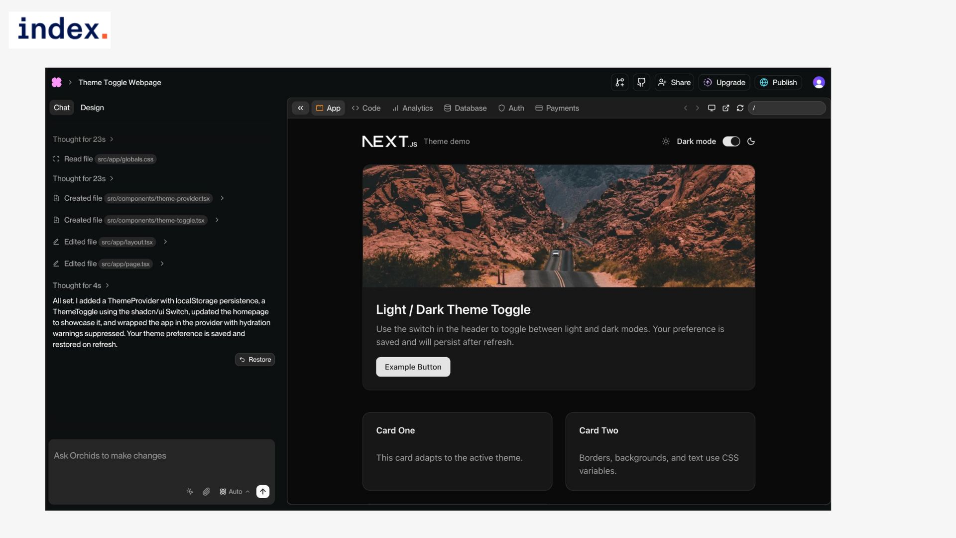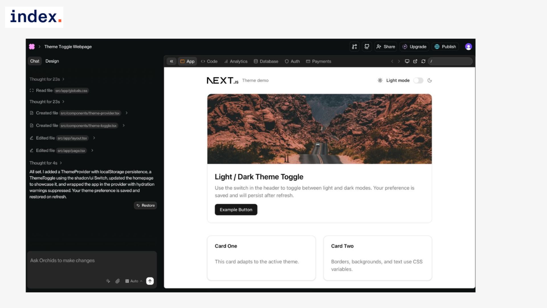 This was one of the clearest demonstrations of Orchids' handling of details that usually frustrate developers. Setting up a theme system manually often means juggling CSS variables, local storage checks, and edge cases like page reloads.