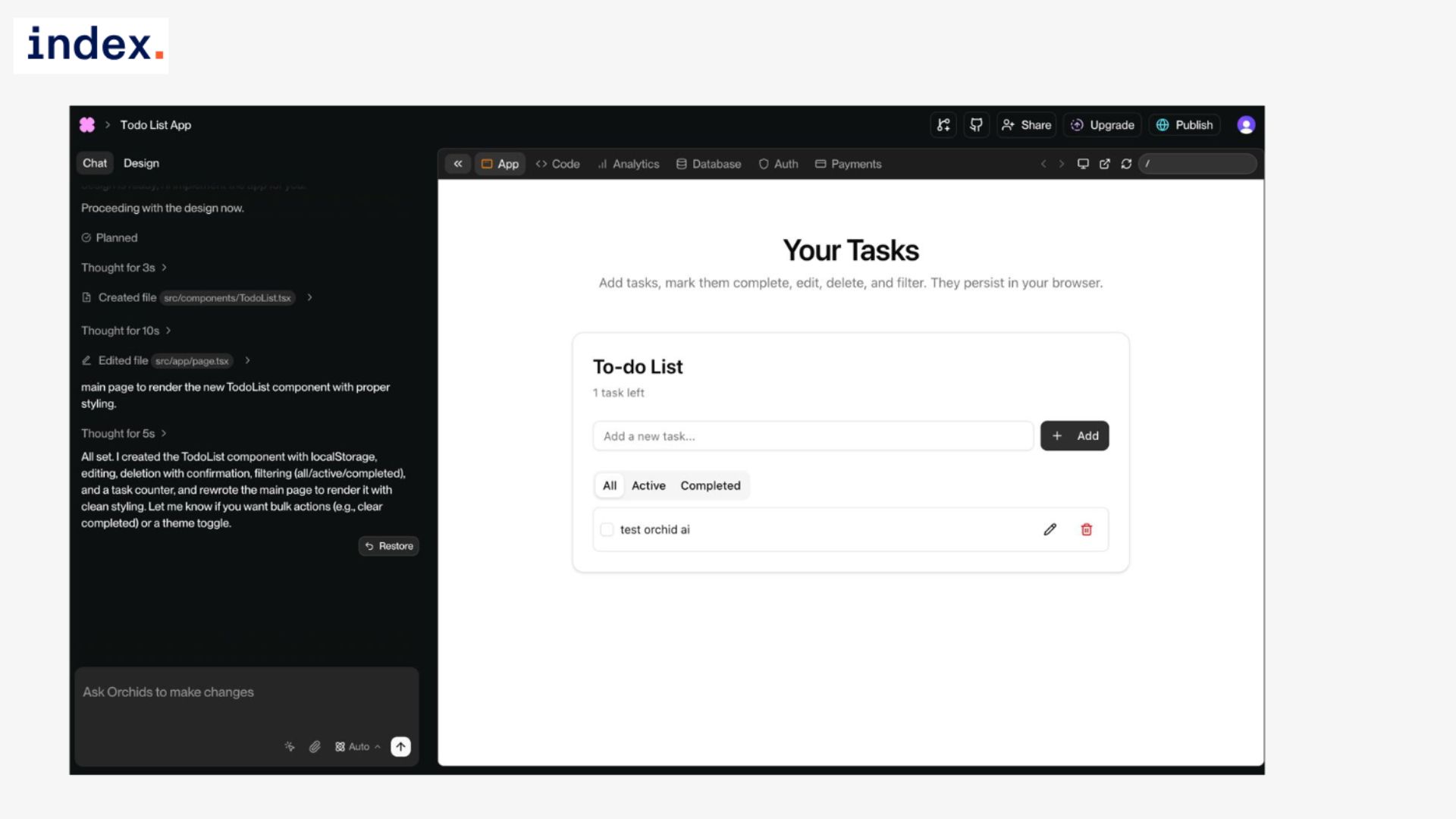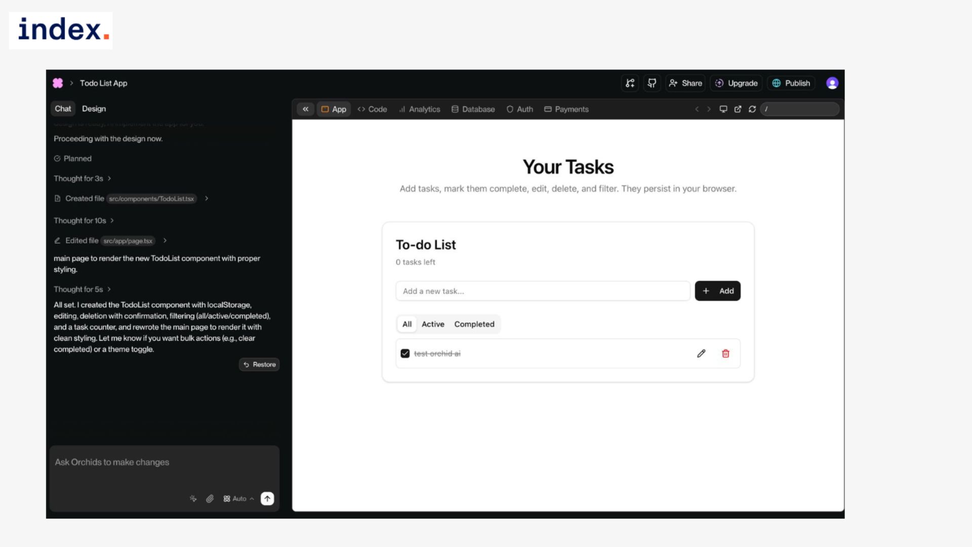 We wanted to test how Orchids handles client-side storage and basic CRUD operations. The task was to build a to-do list app where users can add tasks, mark them as complete, and delete them.