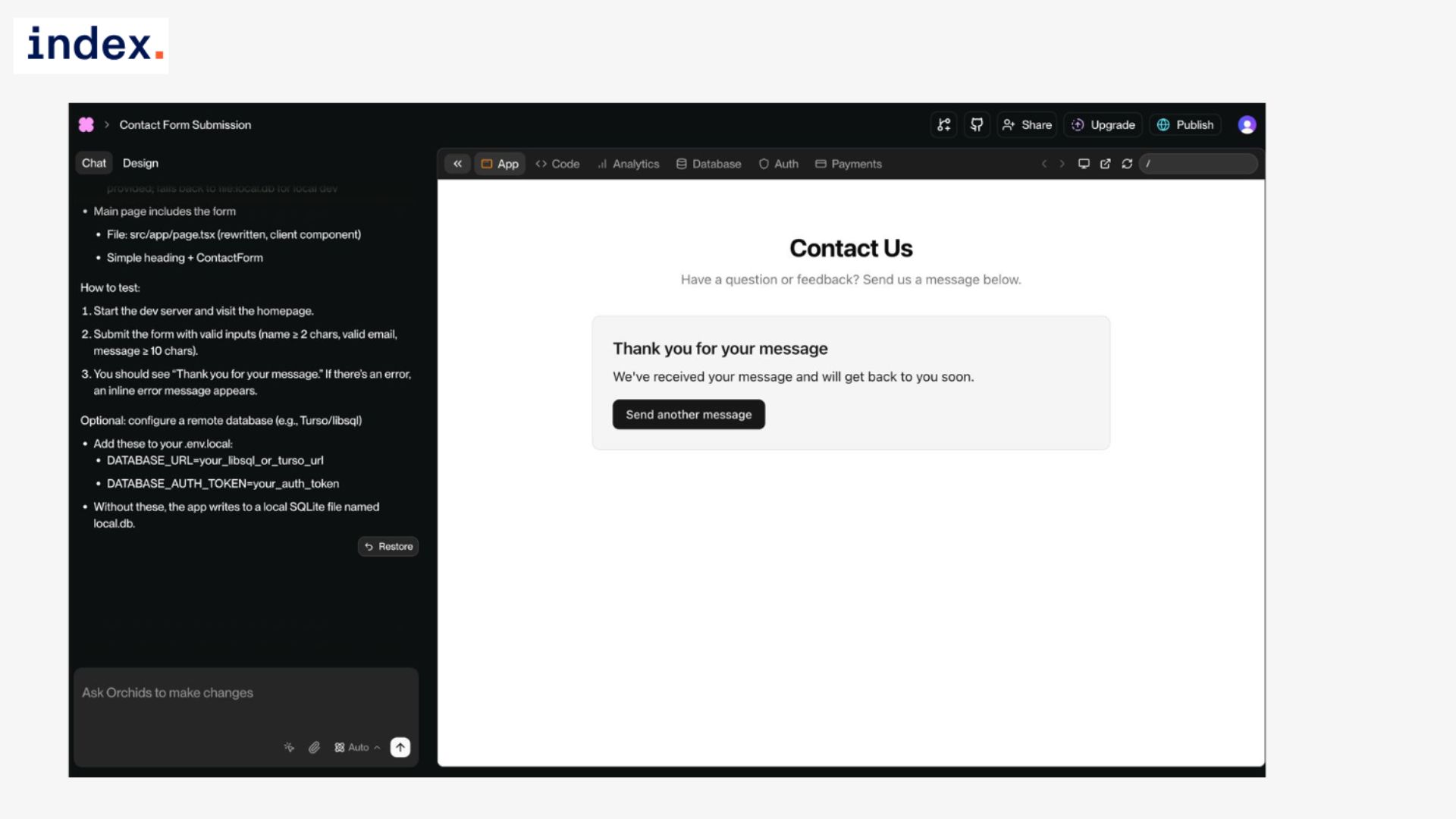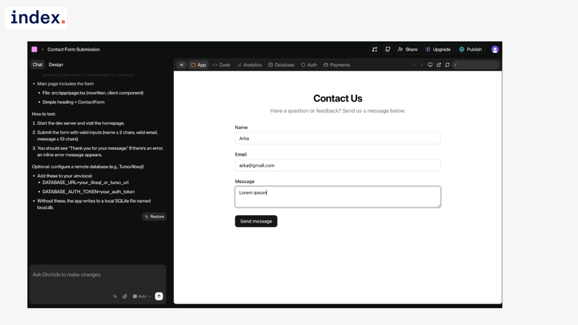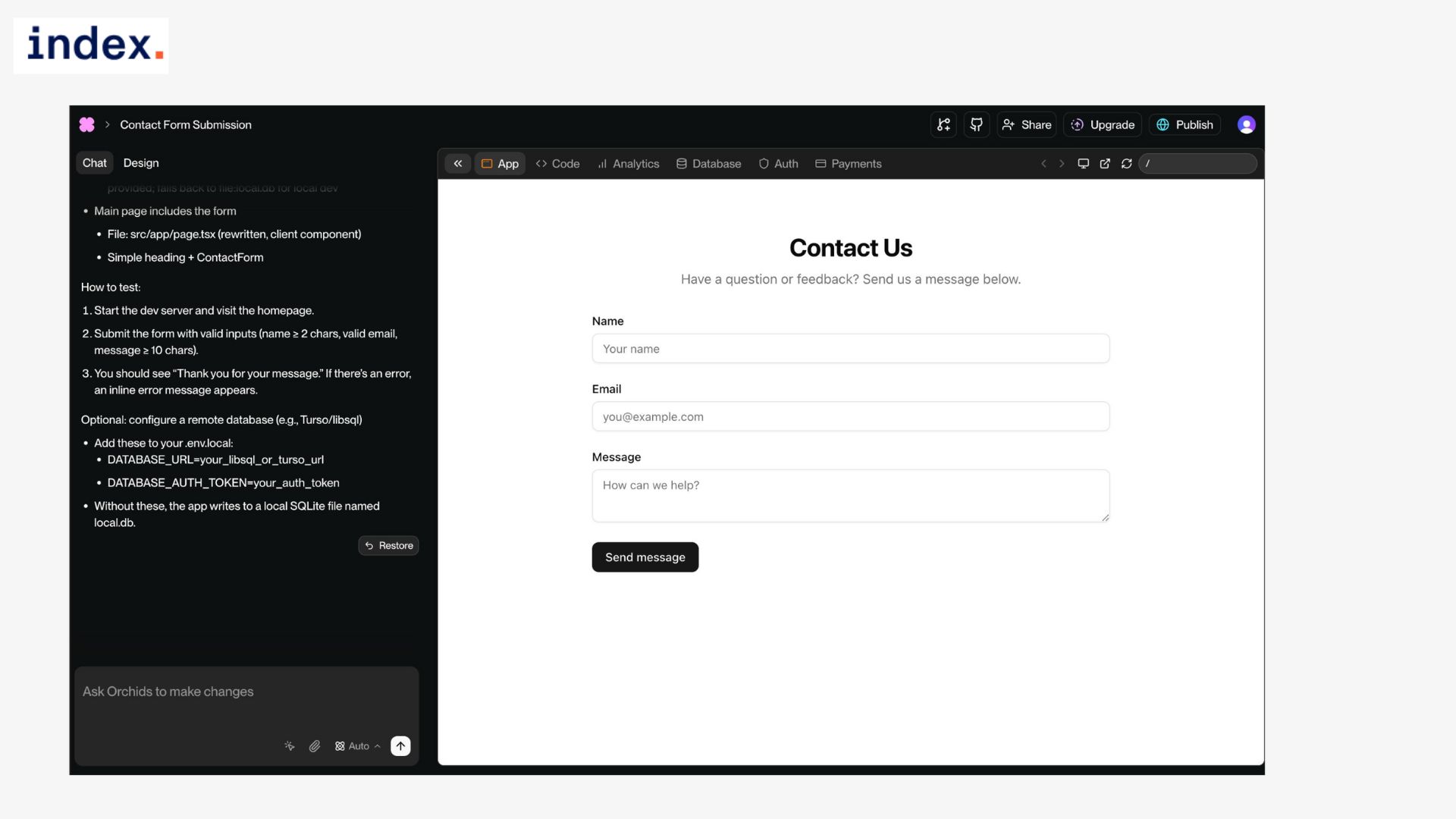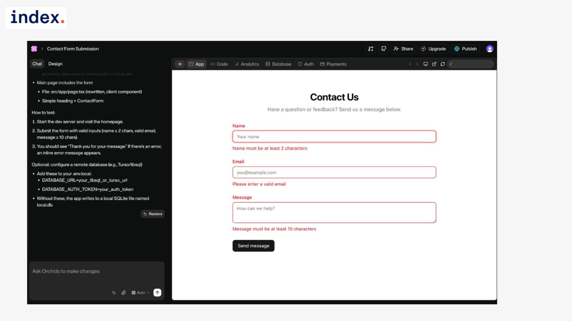 The flow felt complete from start to finish. Frontend validation worked instantly, giving immediate feedback to users before they even tried to submit. On the backend, Orchids set up the database connection, created the schema for storing messages, and linked it all together in one pass. We did not have to touch any code for input checks, endpoint wiring, or confirmation handling.