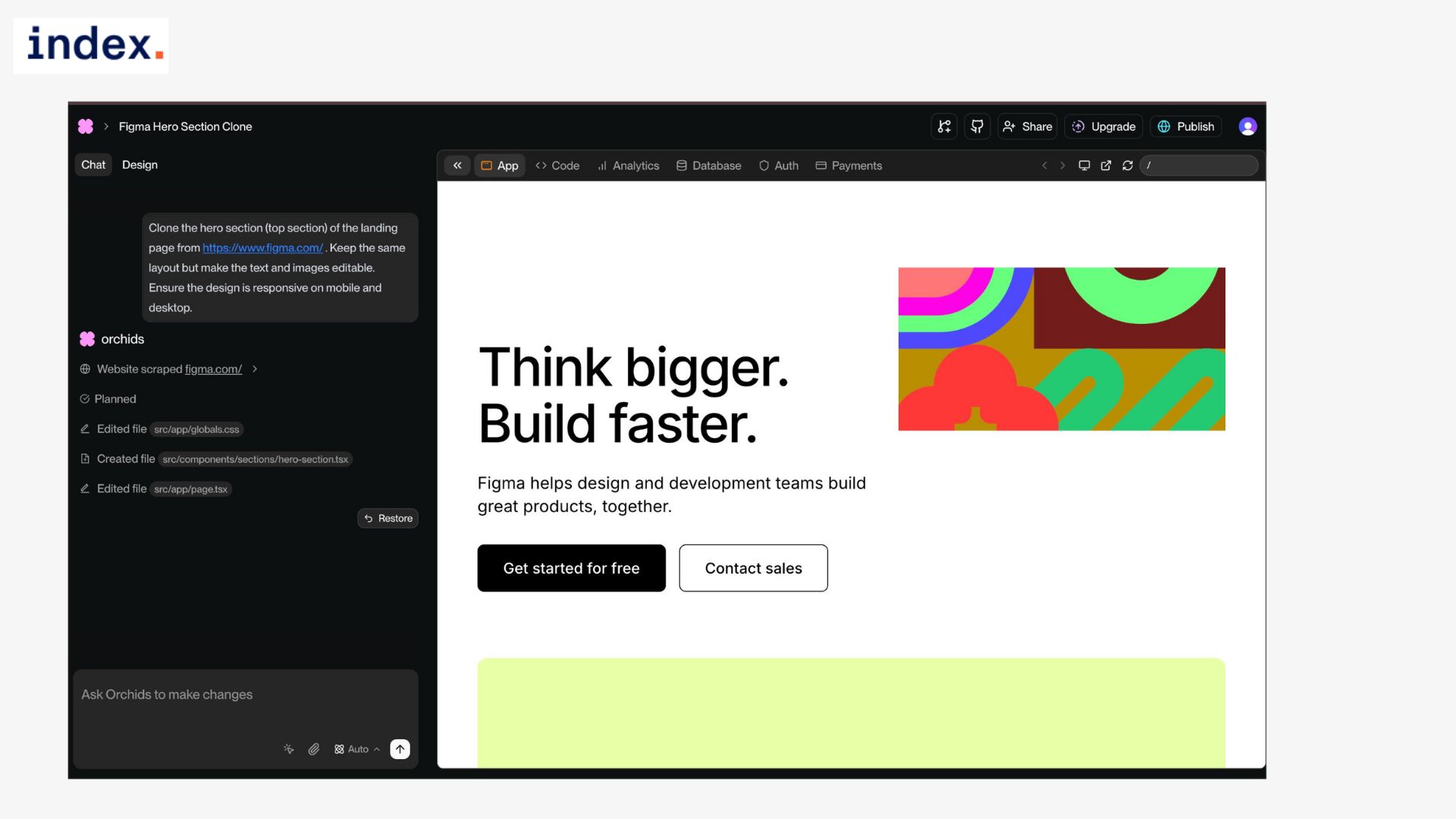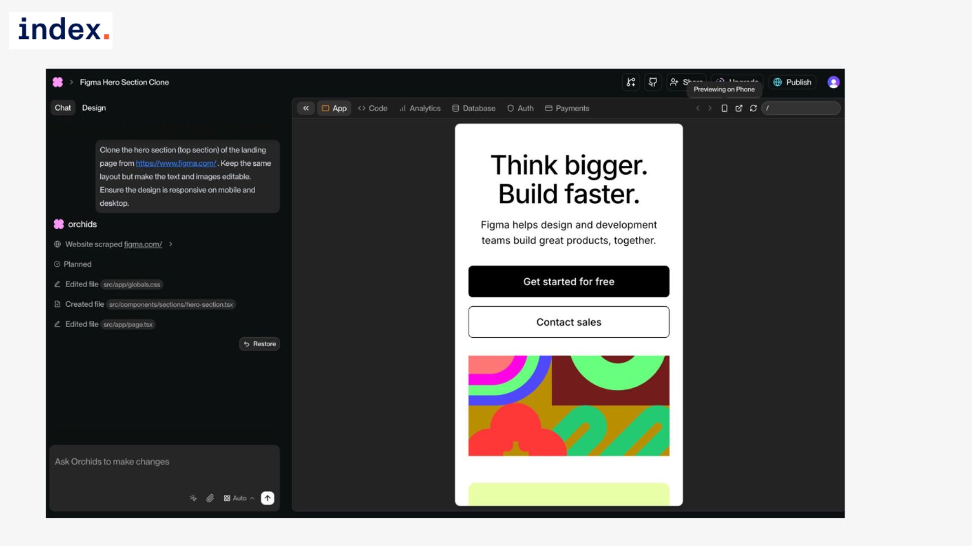 This test was designed to see how well Orchids could replicate an existing design from a live site. The idea was to clone the hero section from the Figma landing page, keeping the same layout, structure, and styling, while also making sure the design was editable and responsive across devices.