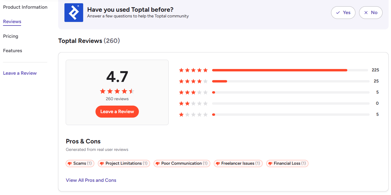 Toptal has 4.7 stars on G2 and Trustpilot, though users note that transparency around pricing could improve.