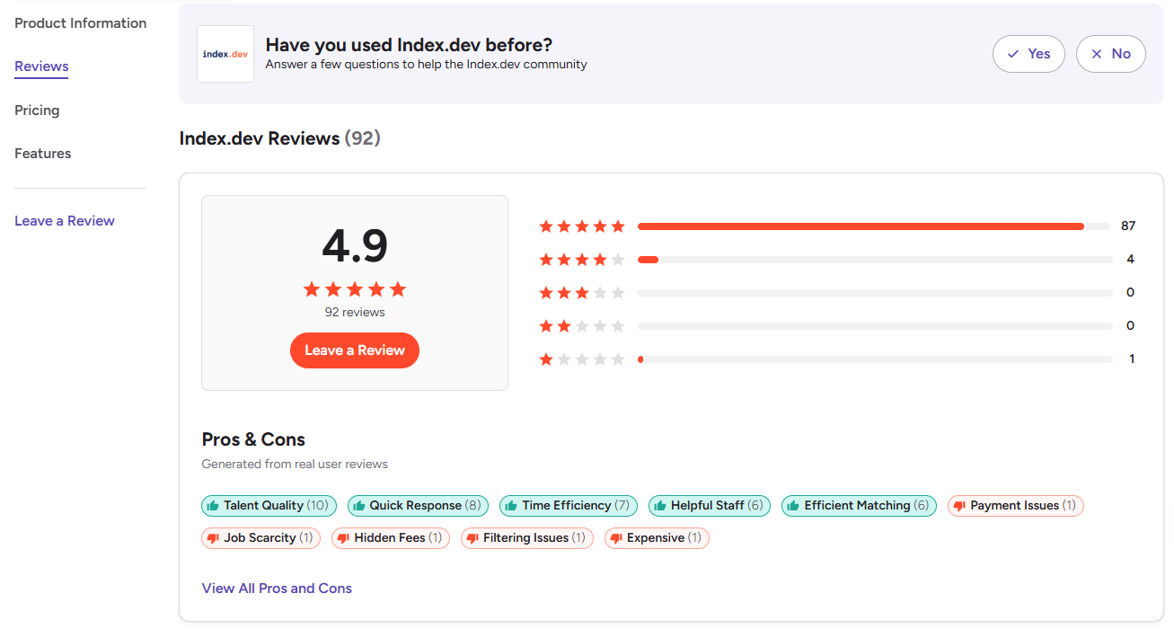 If you're evaluating alternatives, Index.dev operates on a curation-plus-AI model. Like Toptal, we screen aggressively (top 5% of applicants). Like Proxify, we offer transparent fixed pricing and fast matching. We use AI to surface candidates, but humans to verify fit.