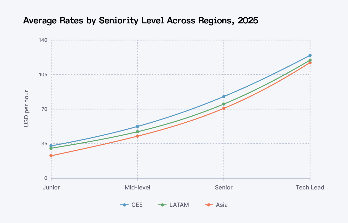 - CEE offers high-quality developers with competitive rates, particularly in Poland and Ukraine.