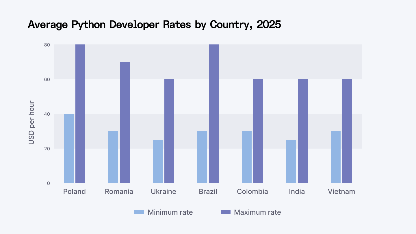 - Poland: Poland is one of the leading outsourcing destinations in CEE, with Python developers charging between $40 and $80 per hour.