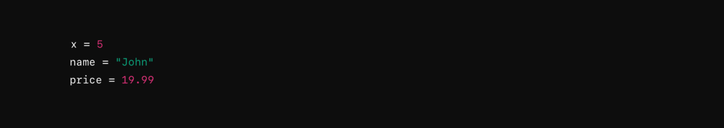 For example, x = 5 puts an integer in memory location x name = " John" automatically reserves space and points to a string named name price = 19.99 makes price into a float In this way, Python supports swift and easy variable name assignments which are entirely attuned with the dynamic nature of Python itself.