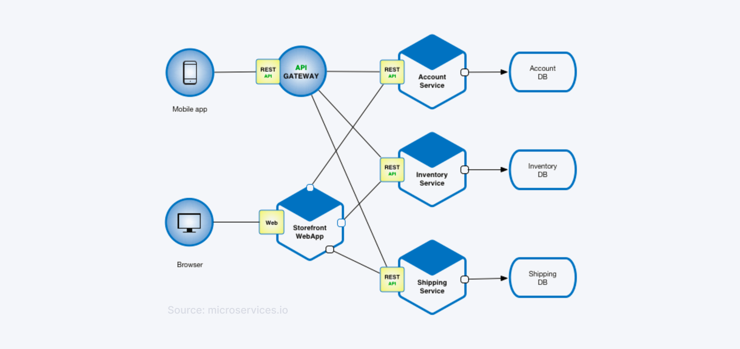 A modular (microservices) architecture lets teams develop features (e.g. user accounts, inventory, shipping) independently behind a shared API gateway. This isolation speeds delivery and reuse, cutting dev costs and cycle time.