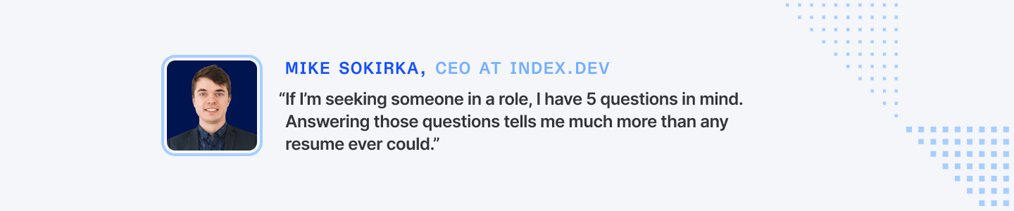 If I’m seeking someone in a role, I have 5 questions in mind. Answering those questions tells me much more than any resume ever could. – Mike Sokirka, CEO at Index.dev
