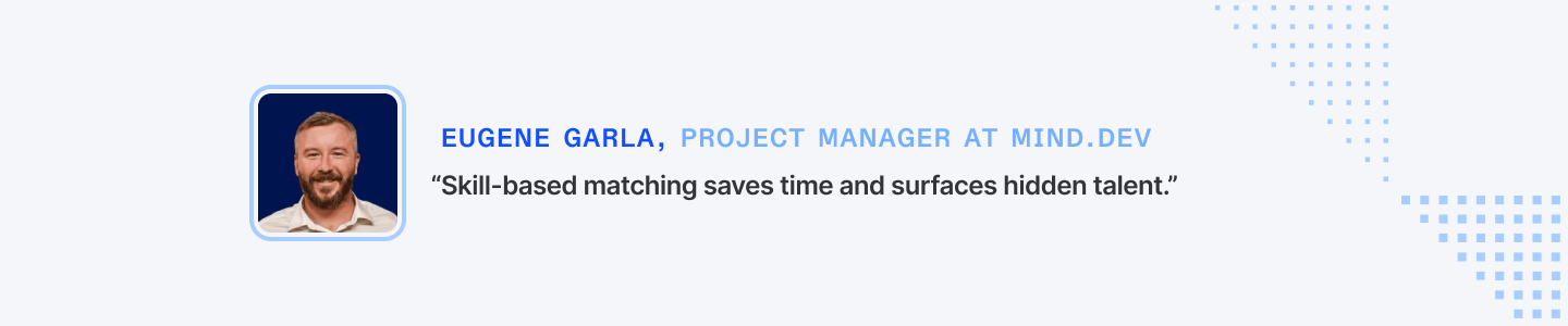 “Skill-based matching saves time and surfaces hidden talent.” – Eugene Garla, Project Manager at MIND.dev