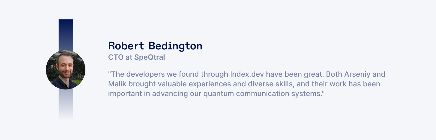 "The developers we found through Index.dev have been great. They brought diverse skills and diverse skills, and their work has been important in advancing our quantum communication systems." – Robert Bedington, CTO at SpeQtral