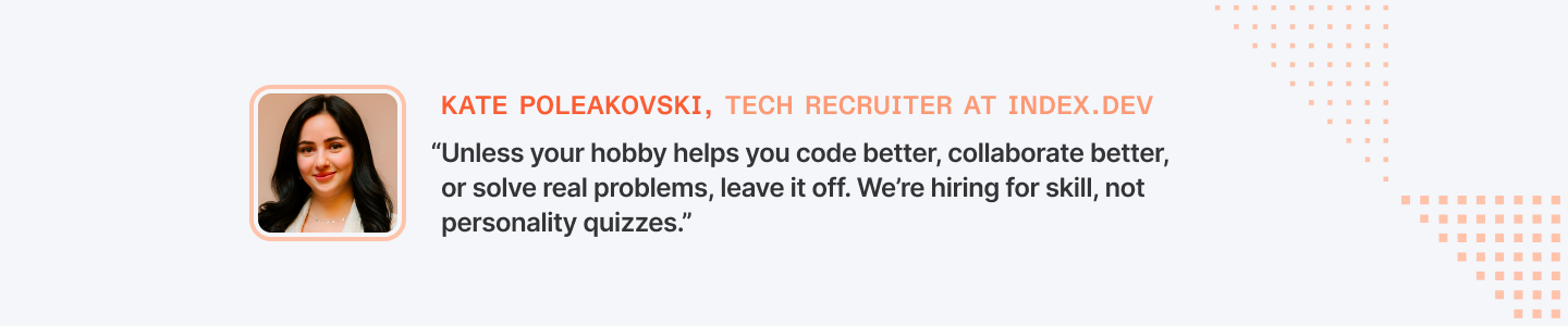“Unless your hobby helps you code better, collaborate better, or solve real problems, leave it off. We’re hiring for skill, not personality quizzes.” – Kate Poleakovski, Tech Recruiter at Index.dev