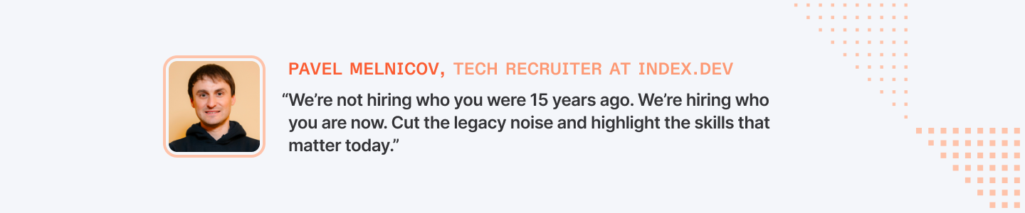 “We’re not hiring who you were 15 years ago. We’re hiring who you are now. Cut the legacy noise and highlight the skills that matter today.” — Pavel Melnicov., Tech Recruiter at Index.dev