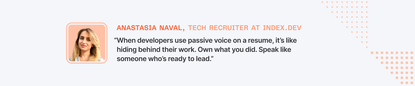 “When developers use passive voice on a resume, it’s like hiding behind their work. Own what you did. Speak like someone who’s ready to lead.” — Anastasia Naval, Tech Recruiter at Index.dev