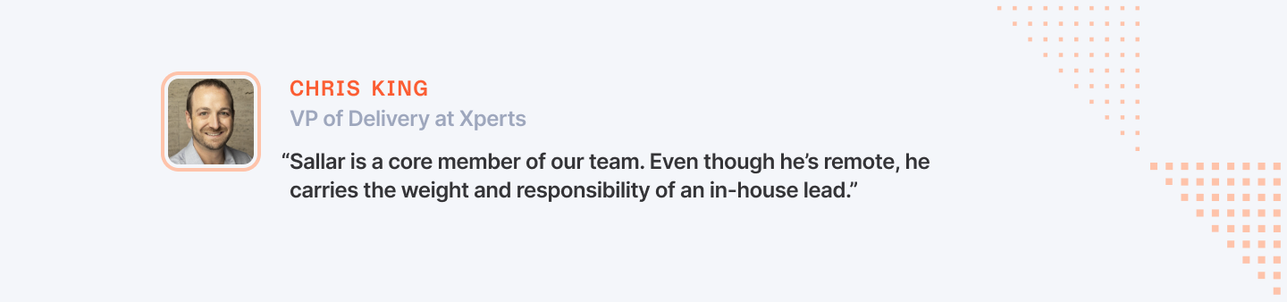 “Sallar is a core member of our team,” said Chris King, VP of Delivery. “Even though he’s remote, he carries the weight and responsibility of an in-house lead.”